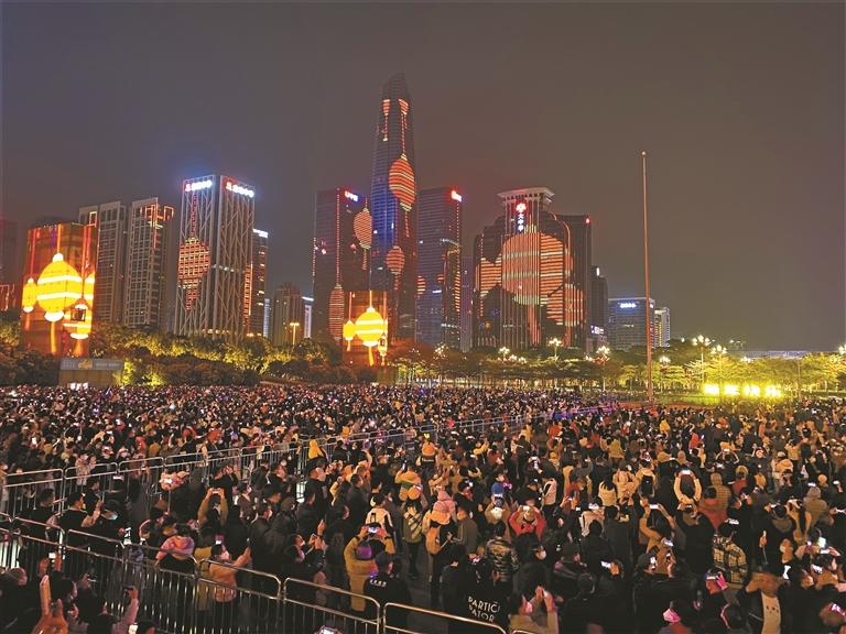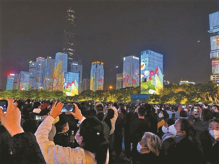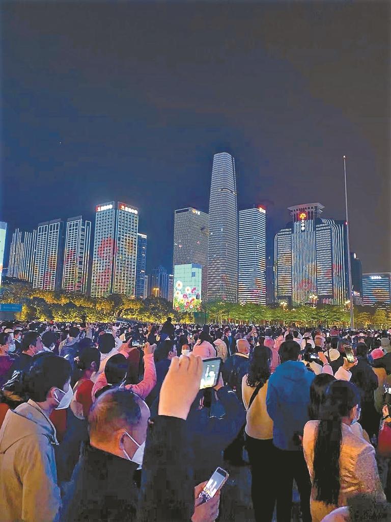 今年春节,深圳各区共4处灯光表演恢复亮灯,为广大留深市民及来深游客提供了璀璨绚丽的视觉盛宴,营造了热烈喜庆的节日氛围。深圳市中心区灯光秀,几天时间吸引数十万市民、游客前来观赏。灯光一起,市民的手机也开启“工作模式”,有的从头到尾录制视频,有的不停咔咔拍照。朋友圈又掀起一波灯光秀热。