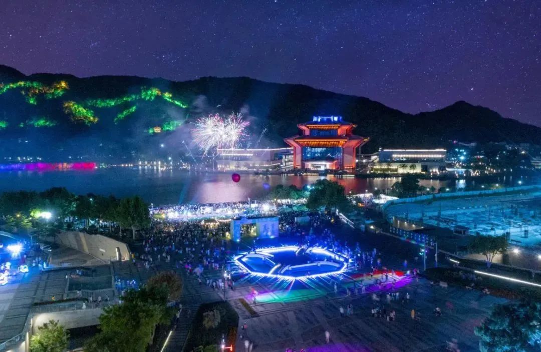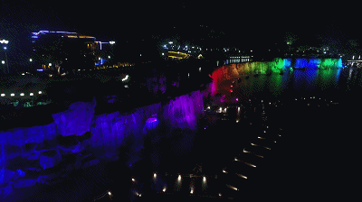 每晚7点半,听音湖上“樵山瀑影”准时亮灯,一片流光溢彩,如幻境一般的灯光瀑布、绚丽的灯影变幻仿佛,让人置身于赛博朋克的世界。
