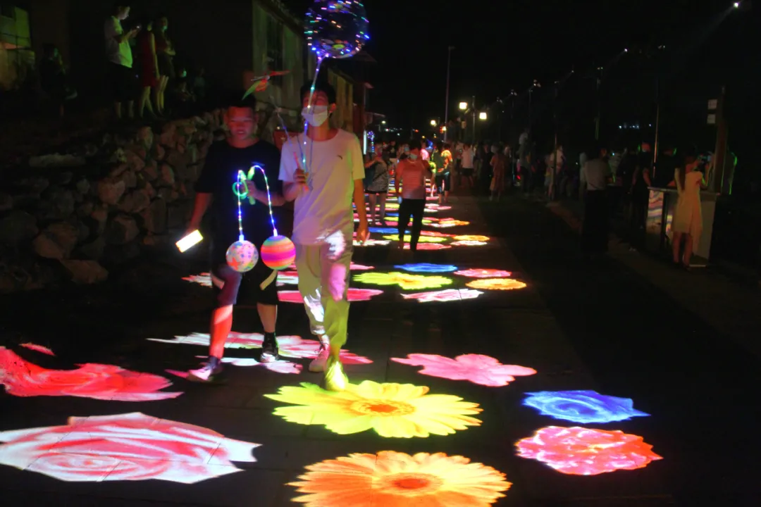在永安市贡川镇大儒里广场,游客通过体验3D水幕秀,人行步道投影,沉浸式夜游打卡点,感受贡川千年古镇的山水和人文魅力。