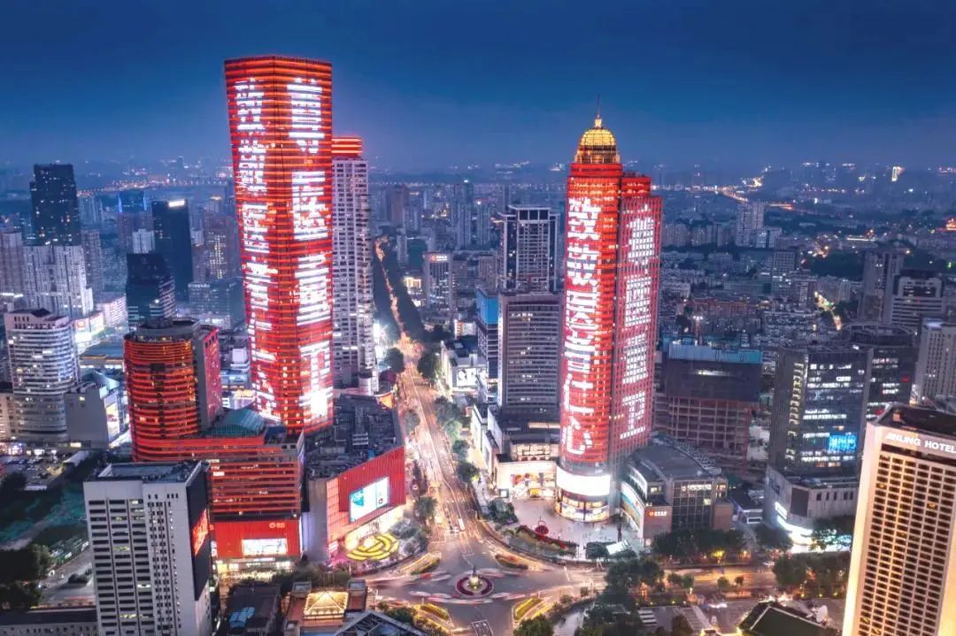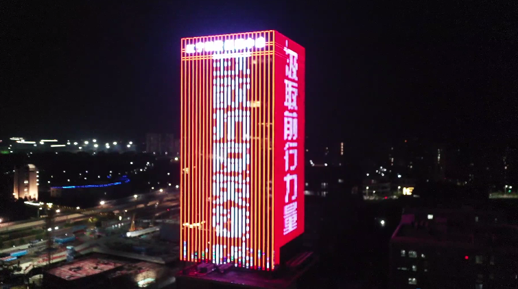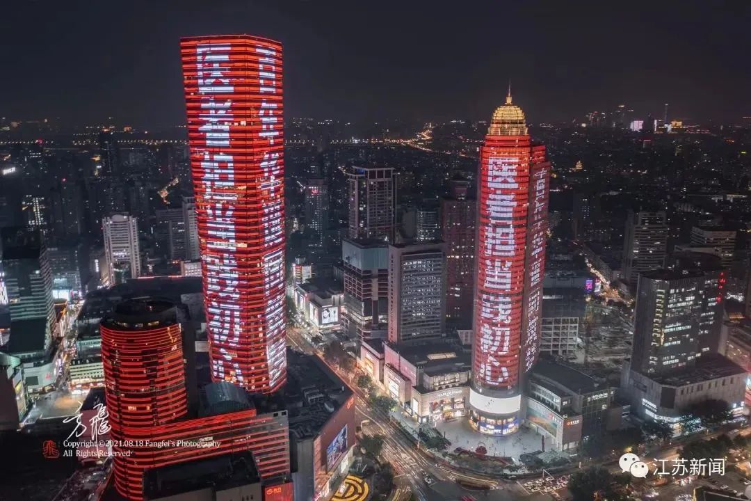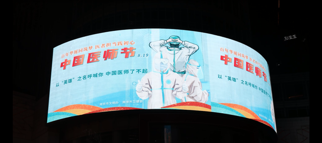 晚上7点多,夕阳还未完全落下,暮色中,新街口商圈的高楼被点亮。“百年华诞同筑梦,医者担当践初心”等文字在楼体上滚动播放,十分醒目。
