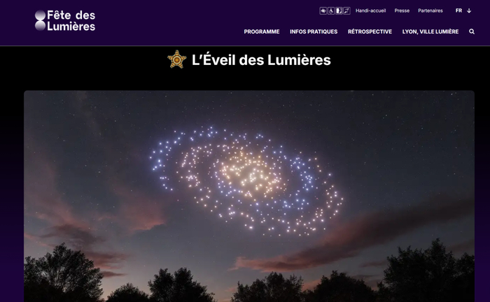 《L’Éveil des Lumières(光之觉醒)》灯光秀将由500架无人机组成,翱翔天际,重现光的历史.这项科技壮举不仅向当地居民挚爱的蜡烛致敬。这场空中奇观将带领我们沉浸于令人叹为观止的时间流逝和那浩瀚无垠、超凡脱俗的领域。这些无人机重新点亮了天空,在最自然的公共空间中,光影交相辉映。每隔30分钟,500架无人机从纪念岛(Île du Souvenir)起飞,盘旋在金头公园(Parc de la Tête d"Or)的湖面上空,上演一场持续时长8分钟的光之芭蕾。