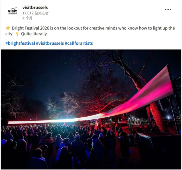 由布鲁塞尔旅游局(Visit Brussels)主办的布鲁塞尔灯光节(Bright Festival),是欧洲极具影响力的城市文化节庆之一。自2013年创办以来,布鲁塞尔灯光节已逐步成长为比利时最具代表性的年度盛典。每年2月,布鲁塞尔都会化身为光影交错的梦幻之都,凭借创新创意的灯光装置与丰富多彩的夜间体验,吸引全球观众与艺术家汇聚于此,共同探索光影与城市碰撞出的奇妙火花。