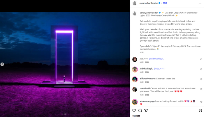 回顾今年年初举办的2025金丝雀码头冬季灯光节,短短的12天里,Canary Wharf聚集了世界各地艺术家创作的璀璨灯饰,呈现11件惊艳的临时艺术装置,以及广受喜爱的永久光影作品,以“转化与异界”从闪耀光影与音乐的浴缸高塔,到迷人的光之龙卷风旋绕在Westferry Circus;从Wren Landing上的纱丽布料与发光丝线交织,到Montgomery Square的虹彩海市蜃楼,再到Wood Wharf的神秘光之入口。最后,在全新开放的Eden Dock,欣赏直径20米的光圈沉洞,这场梦幻之旅让人们沉醉其中。