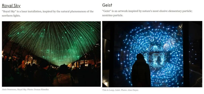 《Royal Sky》是一个激光装置艺术作品,其灵感来源于北极光这一自然现象。作品允许参观者在艺术作品内部和下方自由移动,体验反映北极光在天空中运动的动态光影图案。这件作品与诺贝尔奖得主、物理学家汉内斯·阿尔文有关,他提出了关于北极光的理论。这种自然奇观是太阳带电粒子与地球磁场相互作用产生的,艺术家雅尼斯·彼得森斯用激光投影模拟了这一现象。