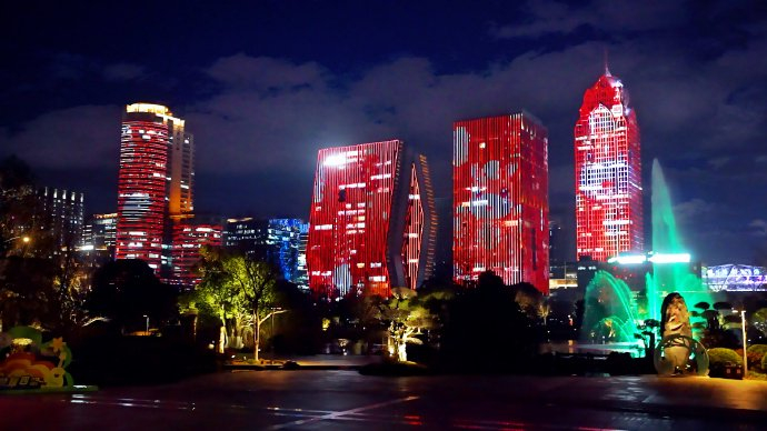 通过LED楼体投影、激光光束与智能联控系统的协同运作,建筑群将化身为一片连绵的立体画布,呈现骏马驰骋、福字流转、烟花绽放等灵动画面。光影随音乐节奏起伏变幻,宛如一幅在夜空徐徐展开的流动长卷,娓娓讲述城市的故事与新春的祝福。